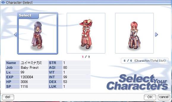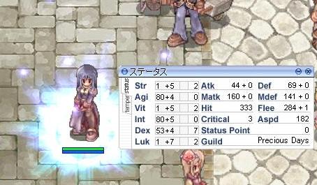 結晶石集めたい!! しかし主キャラでやるとデスペナ痛い!(ぇー う~ん、デスペナっても平気な持ちキャラあったかなぁ? ・ ・・ ・・・ 一人いました。 ちみっこいプリがベースジョブ共にカンストしてる! しかし、ここで悩みます。 養子キャラってR化後ログインするとステで80以上あった部分が80にまで下がるというトラブルがあったはず・・・(汗 これが怖くて今まで養子ではINしてなかったのです。 R化直後は公式HPにこれに関する記述があったはずなのですが、今は消えてなくなっているのですのよね。 しかし、街中ではログインしている養子キャラもちらほらと見かけます。 う・・・ん、直ってるのかな? 意を決して養子プリでINしてみました。 ログイン画面上(SS一枚目)ではちゃんとINT99と表示されています。 ・ ・・ ・・・ ゲーム内(SS二枚目)だとちゃんとINTが80と表示されました(ぇー 直ってないじゃん!! 表示だけの問題なのか実際80しかないのか、わかりませんがこれはやっぱりきつい。 ログアウトしてログイン画面見るとこっちはINT99になってるんだよね~ どっちなんだ!!はっきりしてくれ~ 見た目だけの問題ならまだ許せますが、実際に80まで下がってたらこれやばいよ~