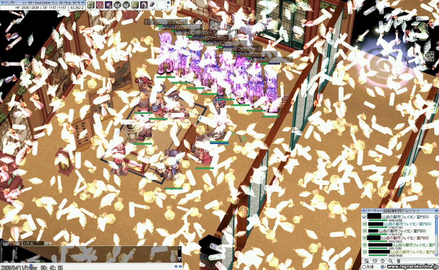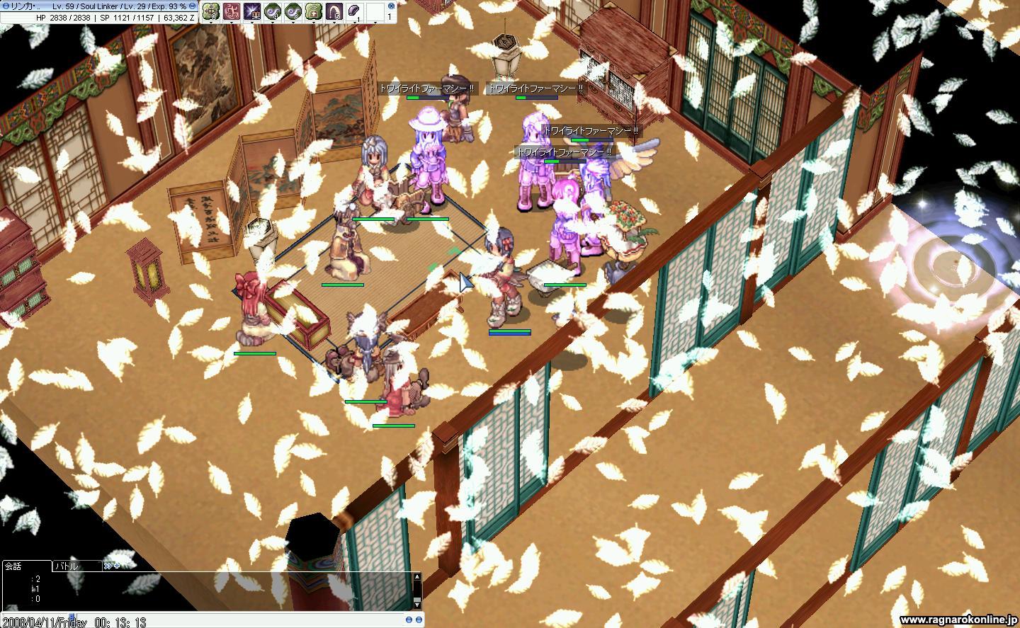 休みが合わないと出れないのがちょいと困るところ・・・ たまには低Lv帯でということになったので私はリンカー(Lv59)で出陣。 場所はウンバラDでした。 G狩り自体はほどなく無事に終了したのですが問題はその後。 私のリンカーでそのGのマスターのケミさんにケミ魂を降臨させた事から流れが変わった。 トワイライトファーマシー発動。 舞うハーブのエフェクト。 ってこのエフェクト、ハーブだったんだ・・・ 今まで花びらかと思ってました(ぇー ふと誰かが言いました。 『これって複数のケミで同時に発動させたらエフェクト重なるのかな?』 この発言で試してみようということになり、ケミさん二人で同時にトワイライトファーマシー発動。 舞うハーブの量が増えた!! 一人のときのSSは取ってないので分かりづらいかと思いますが、どうやら重なるみたいです。 メンバーの別キャラケミを動員して4人でトワイライトファーマシー発動。 もう増量されてカオスな状態に・・・ さらに別メンバーのケミも動員および私も2PCでケミを呼び出し、Sノビやらテコンまで動員されて半ばケミ祭り状態に突入。 ちょっとマテ。ケミ8人とかケミ保有率高すぎだろうw PTにSノビがいるとトワイライトファーマシーⅡが、テコンがいるとトワイライトファーマシーⅢが使えるのです! エフェクトもⅡは白スリム。Ⅲはボトルが舞います。 これらも増量させて舞う姿は壮観でした。 スペース容量の関係でSSは割愛しますけれども(ぇー ふと誰かが言った。 『これって混ぜれるんじゃない?』 そ れ だ ! ってことで混ぜたのがこれ。 舞う白ハーブに白スリム、そしてボトル・・・ ちなみにこのときにはかなりPCに負荷がかかったみたいです。 『グラボイヂメだろ、これw』 私もそう思います。 次の日も仕事だというのにみんなノリ過ぎだw 終わったときには午前一時を回っていました・・・ |